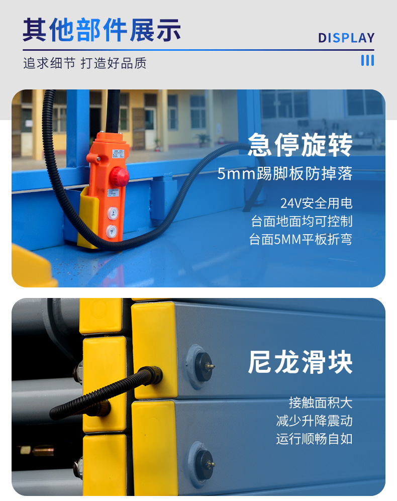产品简介:移动剪叉式升降机四轮移动式液压升降平台为人工移动式,剪叉主结构采用上海宝钢锰钢矩形管制作,液压升降平台平台升降动力为手动或电动,具有移动灵活、升降平稳、操作方便、载重量大等特点。升降动力分为220V或380V电源,采用意大利和国产液压泵站,液压升降平台台面设有防滑绝缘塑质扣板,更换方便,整体美观大方,主要适用于工矿车间、企业、车站、码头、大厦、展馆等各种高空作业场所。