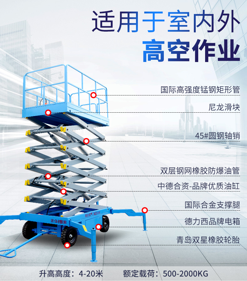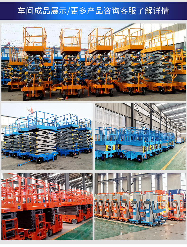 产品简介:移动剪叉式升降机四轮移动式液压升降平台为人工移动式,剪叉主结构采用上海宝钢锰钢矩形管制作,液压升降平台平台升降动力为手动或电动,具有移动灵活、升降平稳、操作方便、载重量大等特点。升降动力分为...